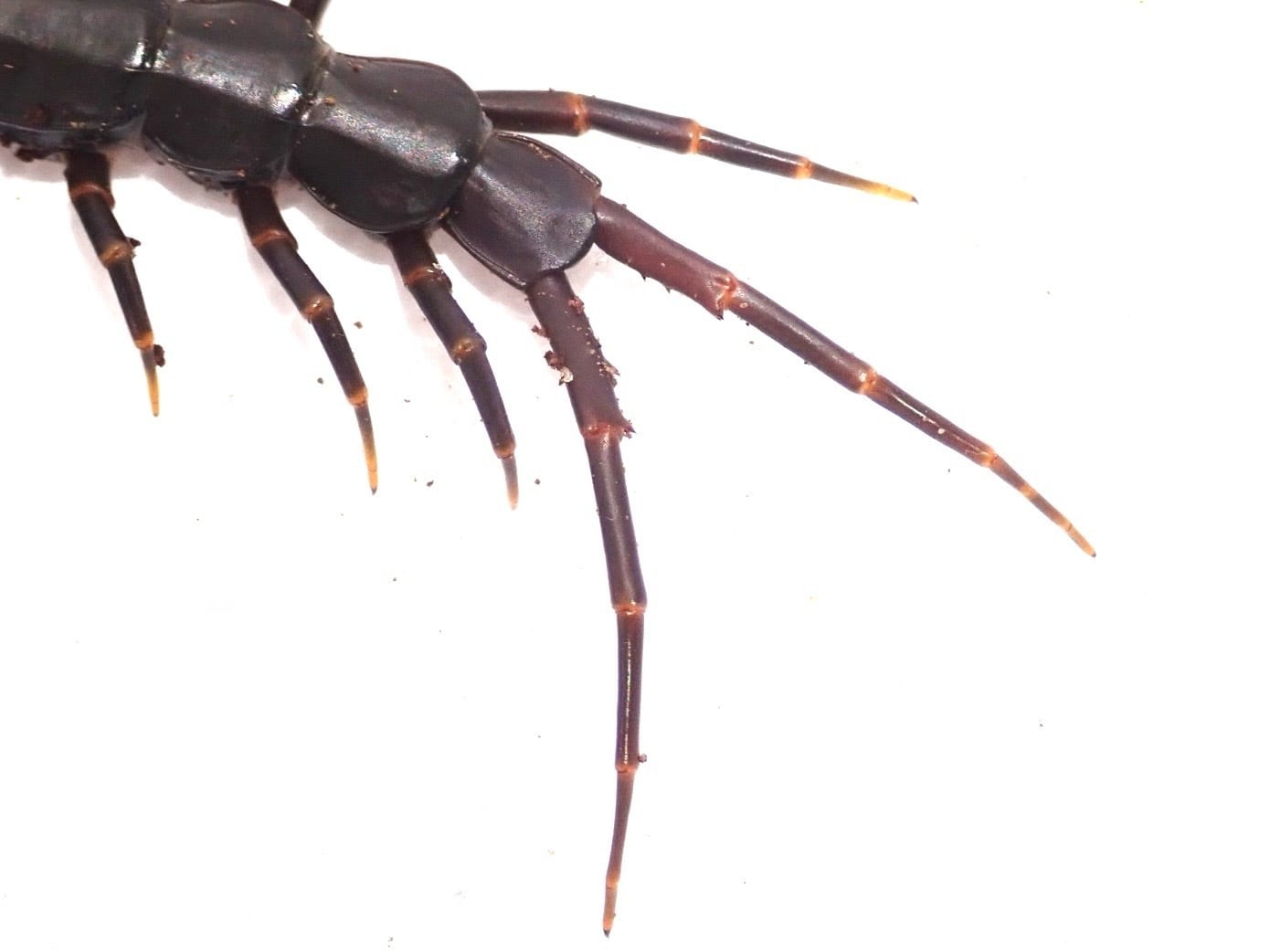 ハイナンブラックタイガーレッグムカデは、その名の通り黒いボディに太いバンド状の模様が特徴です。最大で25cm程度に成長するオオムカデです。